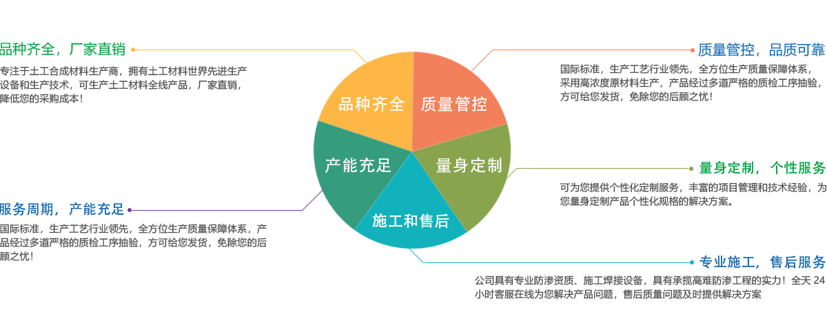 公司所有產(chǎn)品均采用國際標(biāo)準(zhǔn)組織生產(chǎn),并經(jīng)國家、市技術(shù)監(jiān)督局采標(biāo)驗(yàn)收,生產(chǎn)工藝及水平全國領(lǐng)先,屬國內(nèi)優(yōu)等水平,實(shí)物質(zhì)量達(dá)到國際先進(jìn)水平。經(jīng)用戶、施工單位使用證明,質(zhì)量穩(wěn)定可靠、施工方便、價(jià)格合理、售后服務(wù)完善。產(chǎn)品主要應(yīng)用于農(nóng)業(yè)、海綿城市建設(shè)、公路、鐵路、垃圾填埋場防滲,水利、電力、水土保持及環(huán)境綠化與基礎(chǔ)建設(shè)領(lǐng)域,已被廣泛應(yīng)用于高速公路、鐵路、垃圾填埋場等多項(xiàng)國家重點(diǎn)工程,受到工程界專家及廣大用戶的一致好評。